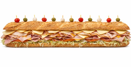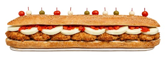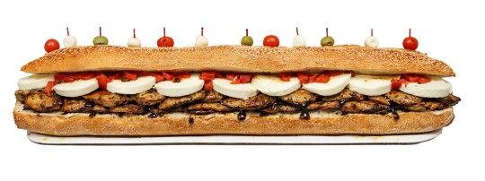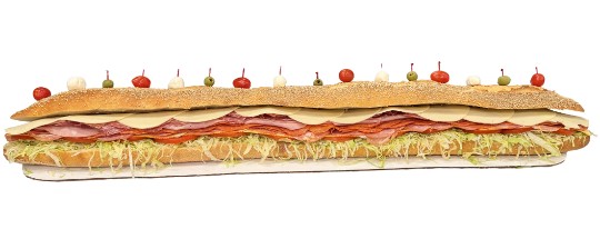 <p>Fresh hero bread layered with iceberg lettuce, tomatoes, muenster, provolone, cappy ham, pepperoni, salami, and mortadella. Finished with ciliegine mozzarella, Castelvetrano olives, and grape tomatoes. Served cold, fully assembled, and cut for sharing.</p>